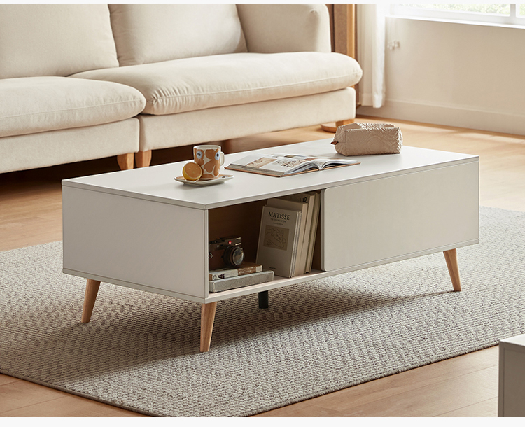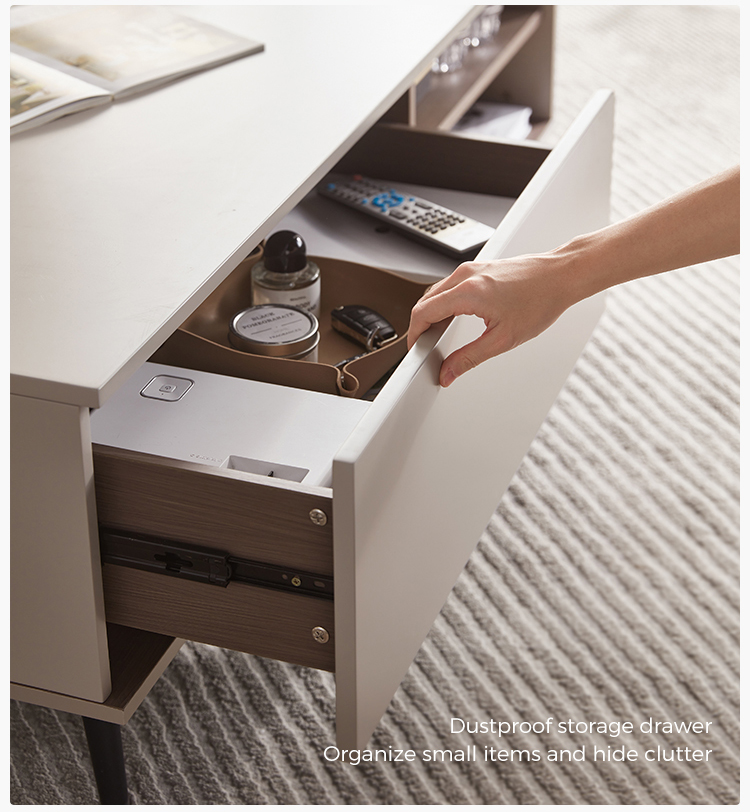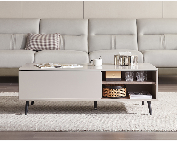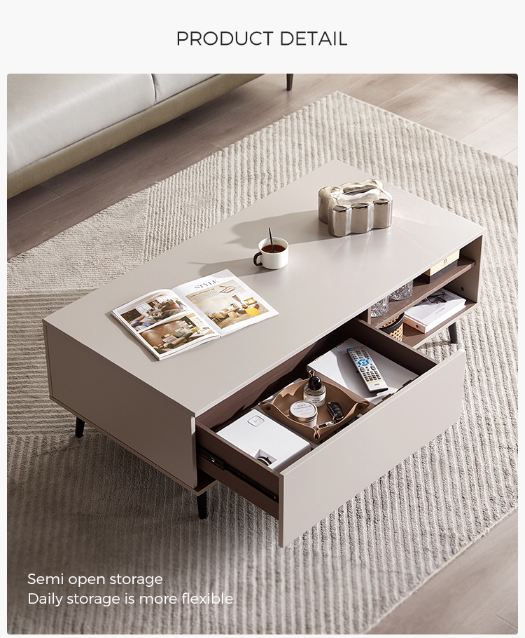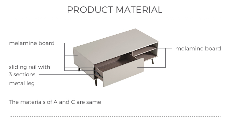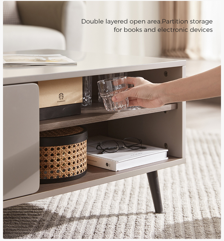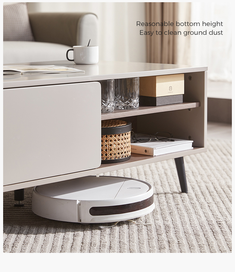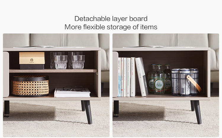 Bagian atas meja kopi ini untuk ruang tamu terbuat dari MDF berkekuatan tinggi, yang tahan air, tahan aus dan resisten suhu tinggi, dan sangat mudah diurus Dekorasi meja kopi untuk ruang tamu halus memberi orang efek visual yang menyegarkan