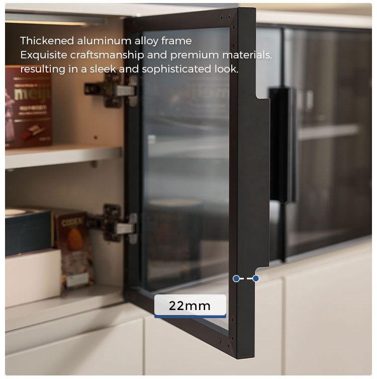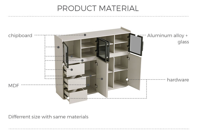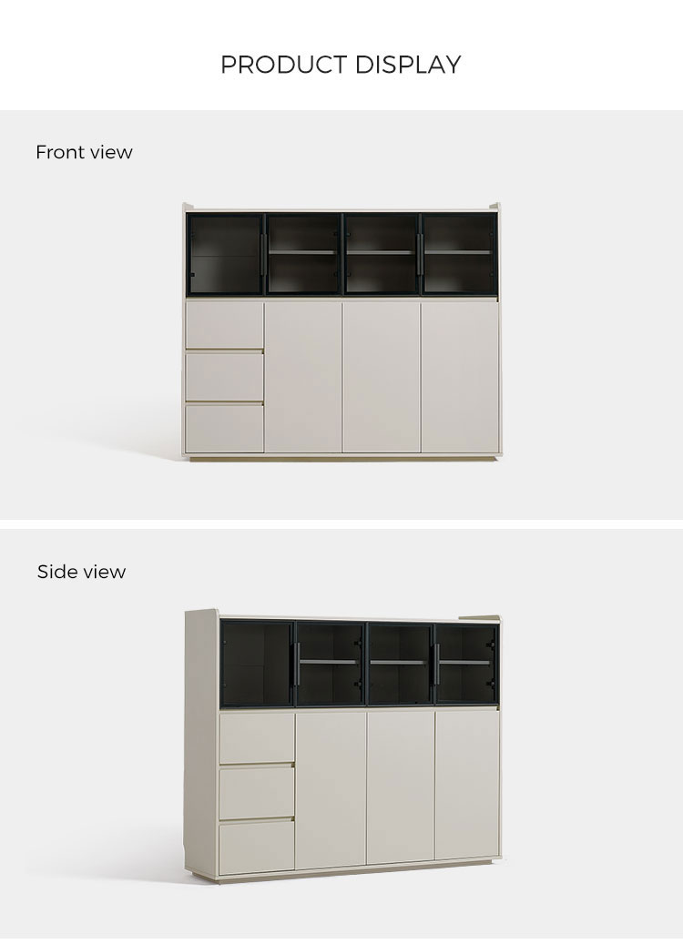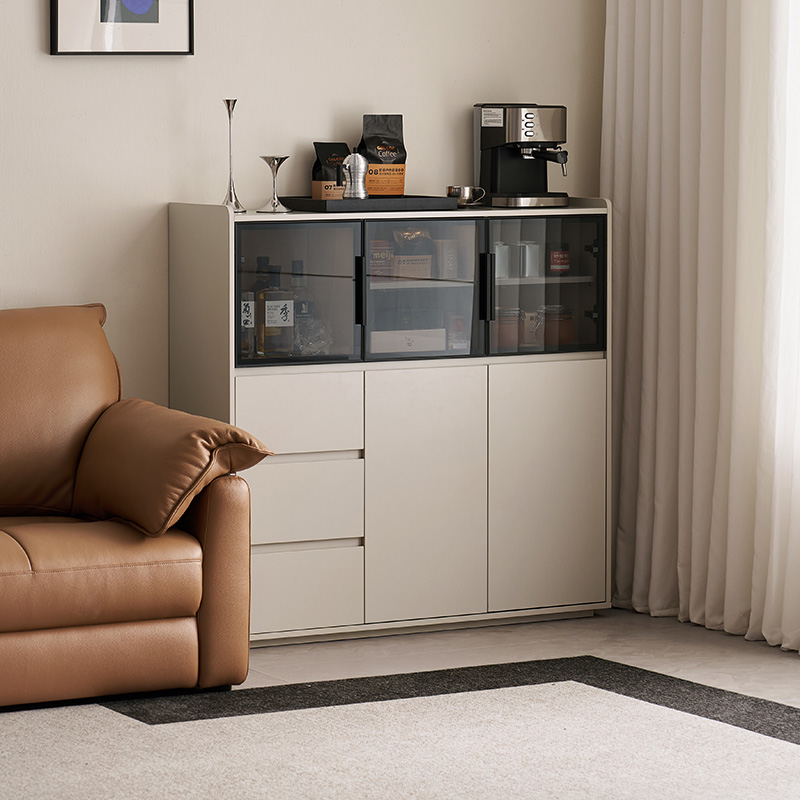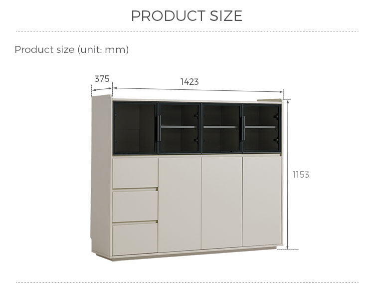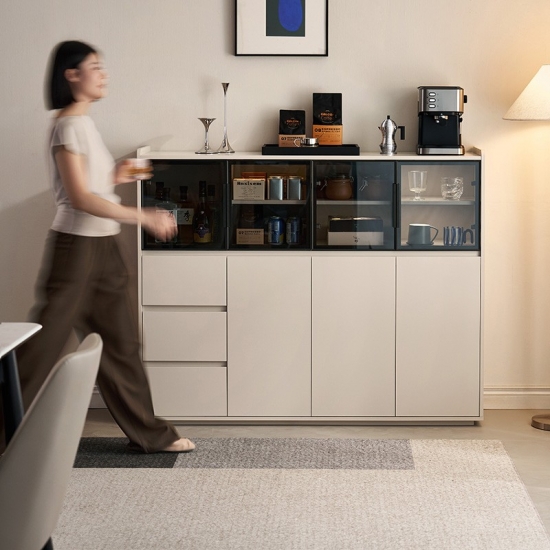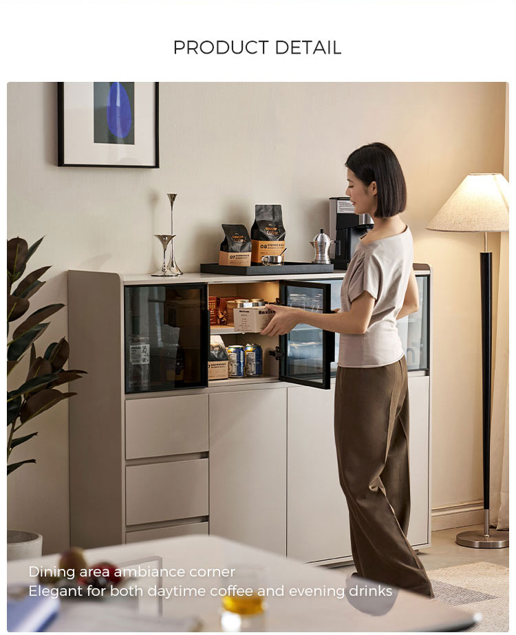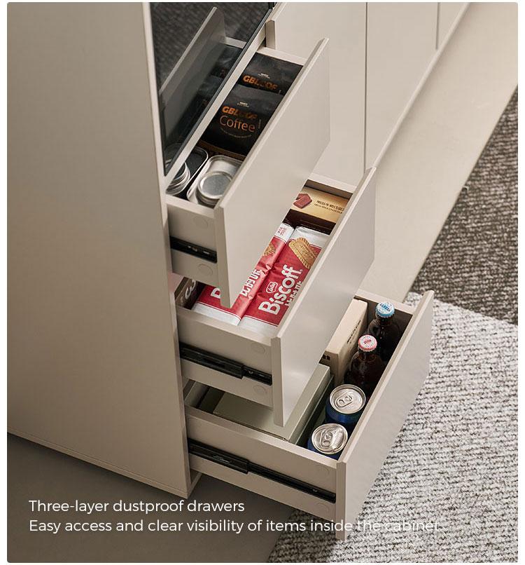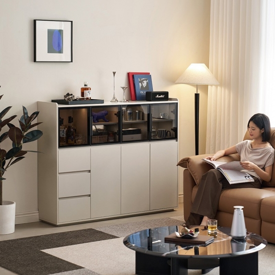 Fitur unggulannya adalah pintu panel kaca besar, yang memungkinkan Anda memajang peralatan makan, gelas, atau barang-barang dekoratif kesayangan dengan penuh gaya sekaligus menjaganya tetap bebas debu. Ini menciptakan kesan visual yang ringan dan terbuka. Melengkapi pintu kaca tersebut adalah beberapa laci luas, yang menyediakan penyimpanan tersembunyi yang cukup dan sangat terorganisir. Laci-laci ini ideal untuk menyimpan peralatan makan, taplak meja, barang-barang keperluan sehari-hari, atau kebutuhan ruang tamu lainnya dengan rapi, memastikan semuanya memiliki tempatnya masing-masing.