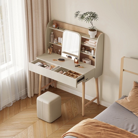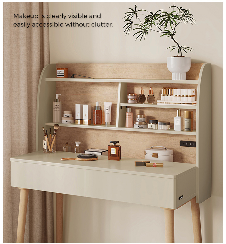 Permukaan Meja Rias Fungsional: Bagian atas yang tahan lama menyediakan area khusus dan luas untuk rutinitas kecantikan harian Anda, produk perawatan kulit, atau aksesori kesayangan.