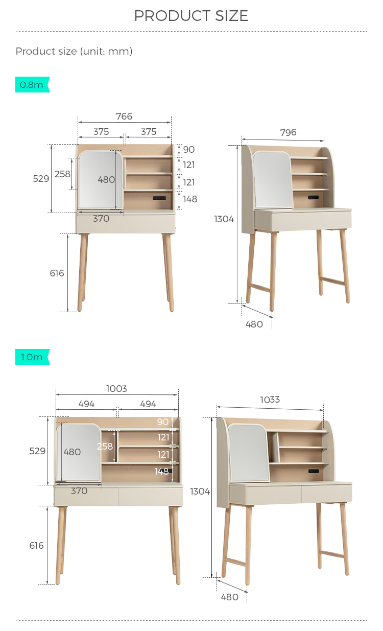 Ukuran 1 Meter yang Dioptimalkan (sekitar 39"): Dirancang agar nyaman dipasang di ruang yang lebih kecil atau sebagai tambahan yang ramping untuk ruangan yang lebih besar, meja rias ini menawarkan permukaan yang substansial tanpa membebani denah lantai Anda.