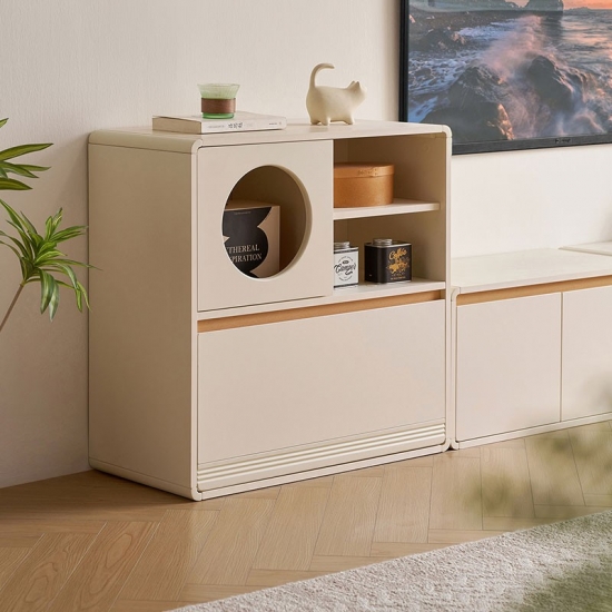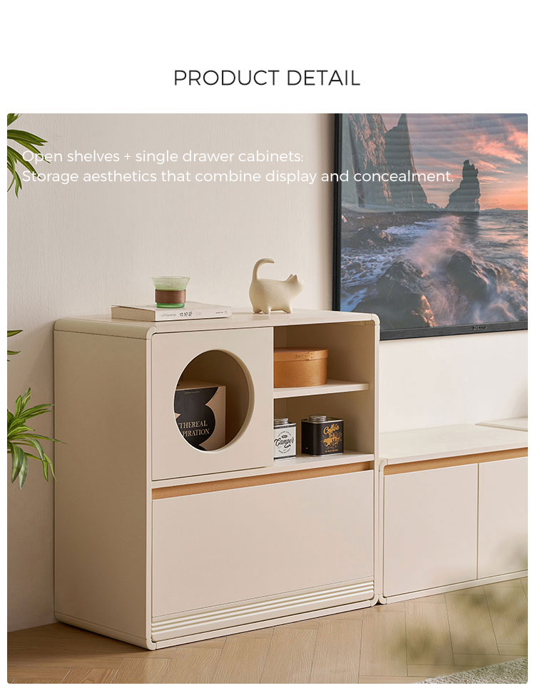 Desain Fungsional: Dirancang untuk keserbagunaan, lemari ini menyediakan ruang penyimpanan tersembunyi yang luas di balik pintu dan laci yang terpasang dengan rapi.