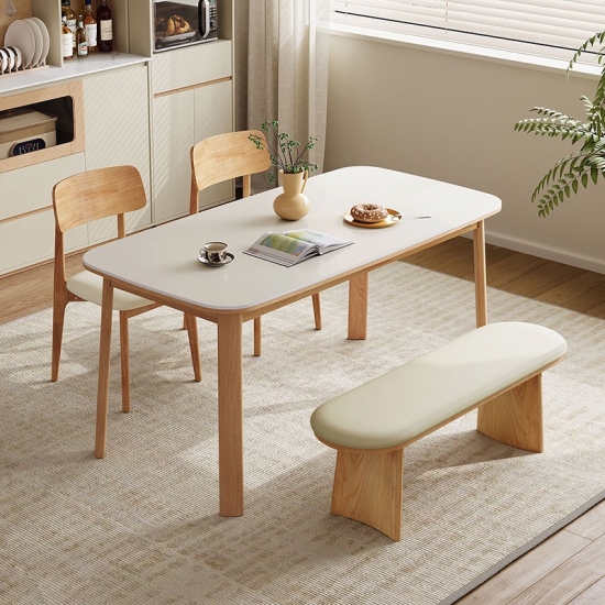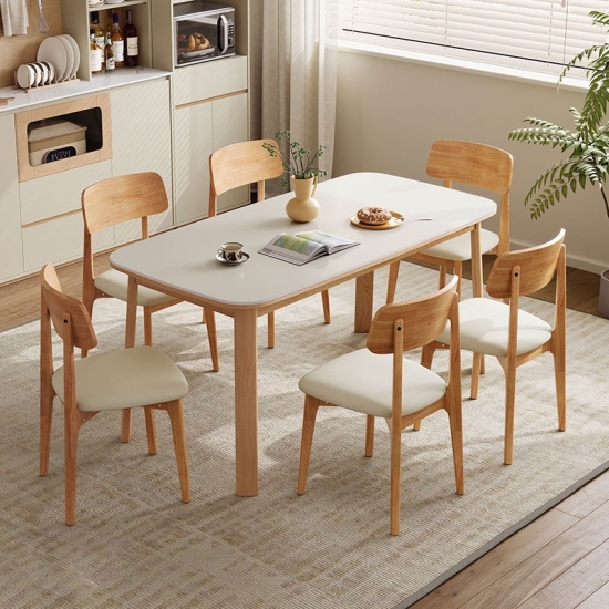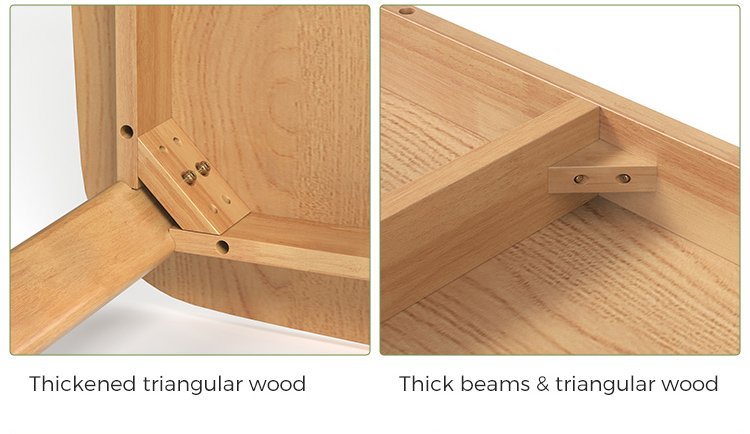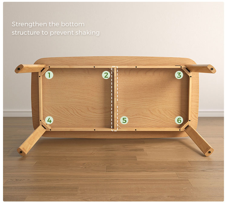 Keindahan Serat Kayu yang Hangat: Rangka kayu yang terekspos menampilkan tekstur alami dan serat kayu solid atau kayu olahan berkualitas tinggi yang kaya. Hal ini menghadirkan kehangatan alami dan karakter abadi pada ruang makan Anda.