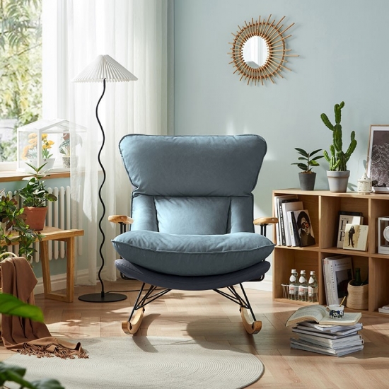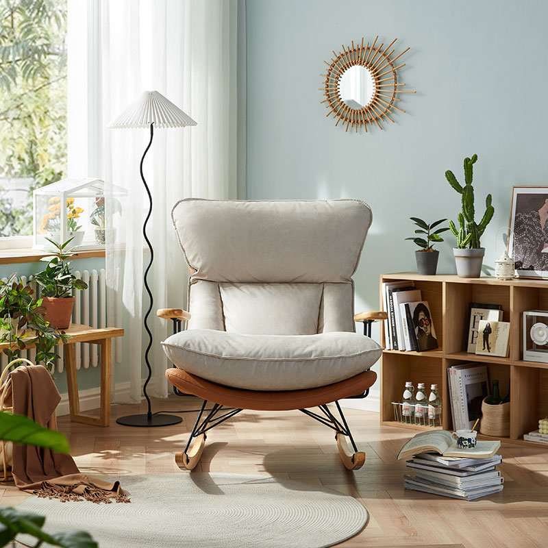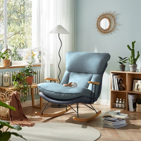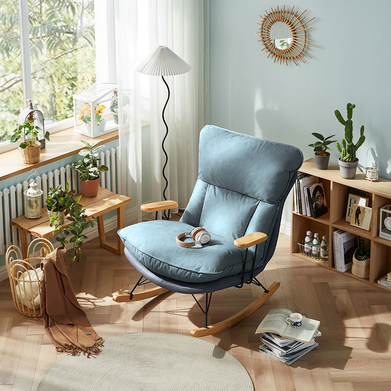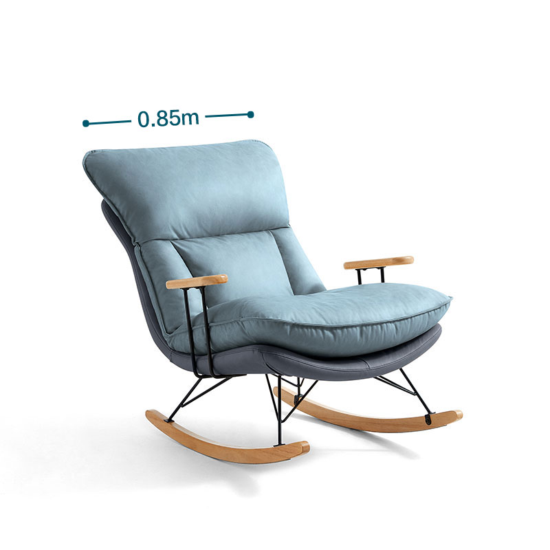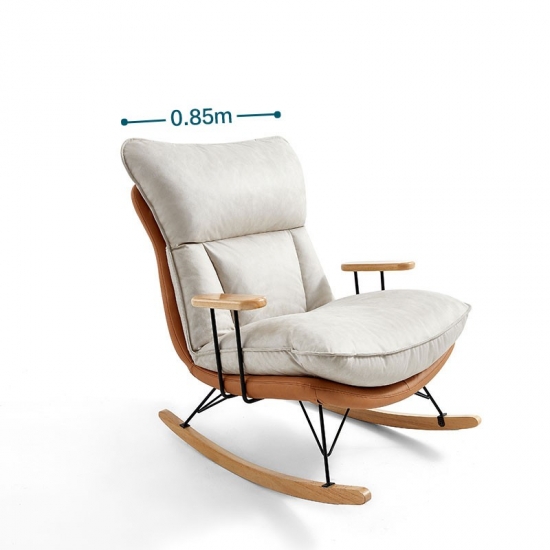 Kursi goyang ini memiliki desain lembut yang sesuai dengan ergonomis, memberikan postur duduk yang nyaman. Kursi santainya dilapisi kulit berkualitas tinggi dan diisi dengan bantalan spons berdensitas tinggi. Kursi goyang tunggal sofa malas ini sangat cocok untuk ditempatkan di ruang tamu, kamar tidur, dan berbagai suasana rumah dan kantor dengan gaya dekorasi berbeda.