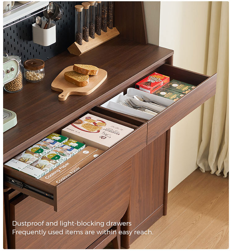 Bufet baru ini menggabungkan pesona vintage abadi dengan fungsionalitas luar biasa. Sentuhan retro yang mewah meningkatkan tampilan ruang makan mana pun, sementara desain multi-lapisan yang cerdas menawarkan ruang penyimpanan yang melimpah untuk semua kebutuhan makan Anda, menjaga semuanya tetap rapi. Dibuat dari bahan yang kokoh—papan melamin yang tahan lama dipadukan dengan rangka kayu solid—bufet ini memastikan kekokohan yang luar biasa dan daya tahan jangka panjang untuk penggunaan sehari-hari.