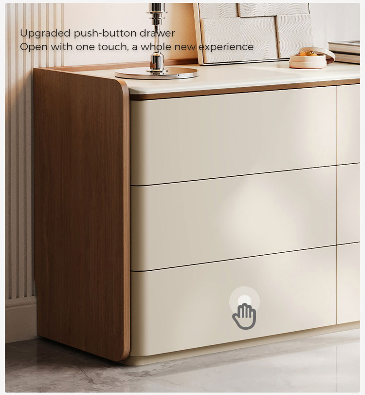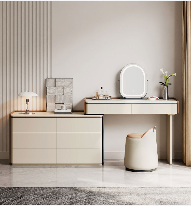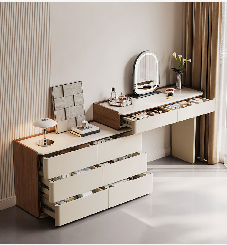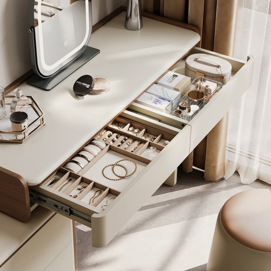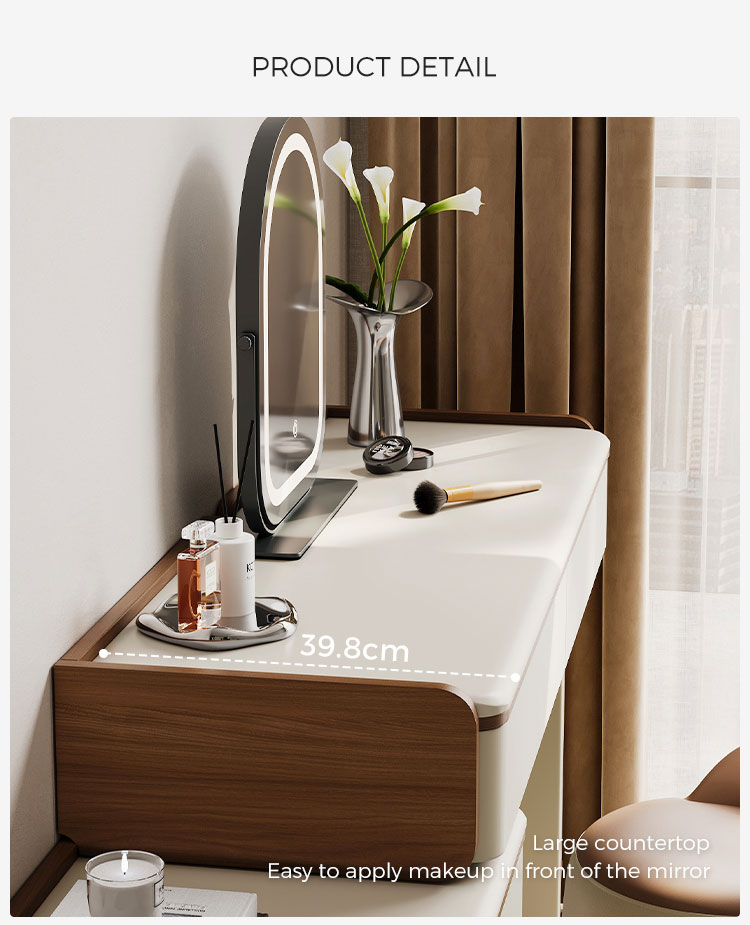 Cermin Terpadu yang Bergaya: Bagian tengahnya berupa cermin berbingkai indah yang terintegrasi dengan cermat di atas meja rias. Ukurannya yang besar memberikan pantulan yang jelas saat berdandan dan merias wajah, sekaligus menambah kedalaman dan cahaya pada ruangan Anda.