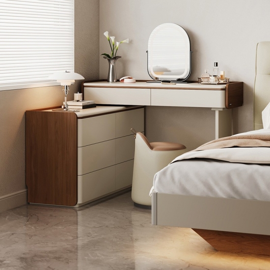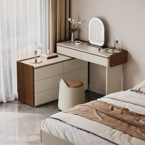 Solusi Hemat-Ruang: Menggabungkan meja rias, meja rias, dan cermin menjadi satu kesatuan akan memaksimalkan fungsionalitas sekaligus mengoptimalkan denah kamar tidur Anda.