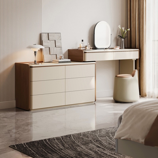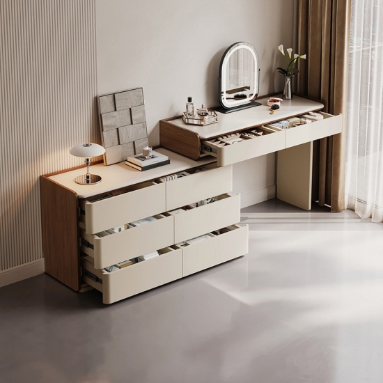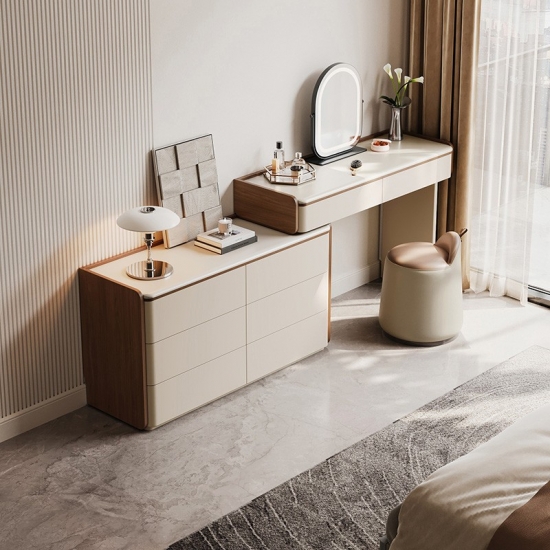 Meja Rias Khusus: Bagian atas yang luas menyediakan platform sempurna untuk ritual kecantikan Anda. Pajang kotak parfum, perawatan kulit, atau perhiasan dengan elegan.